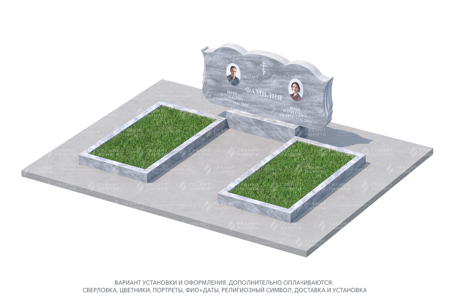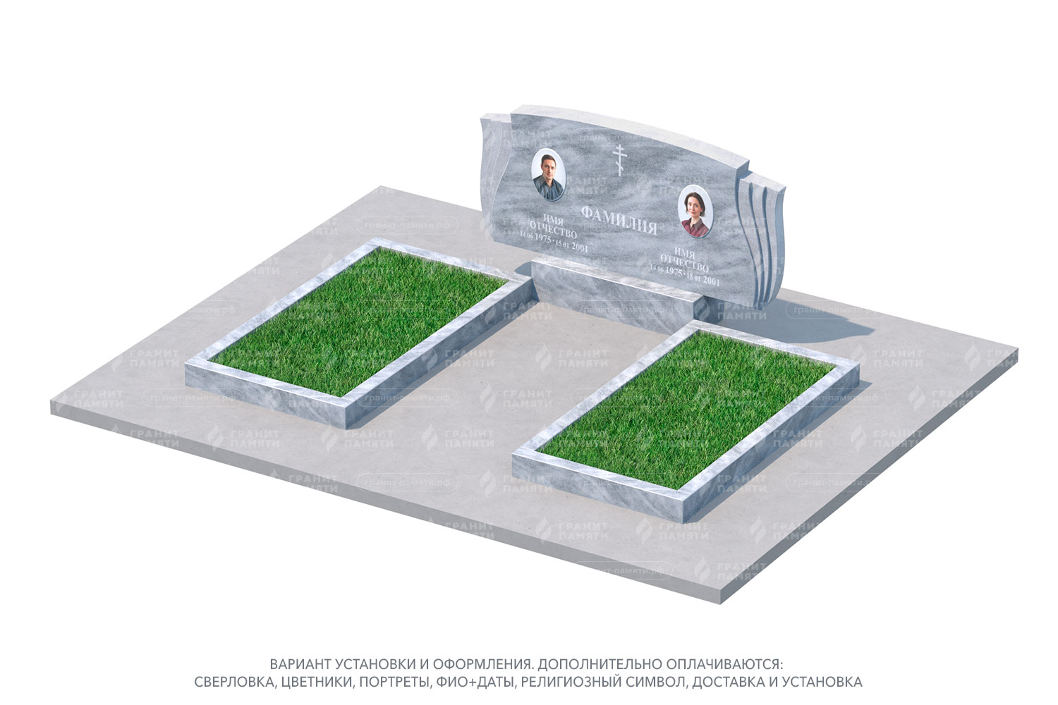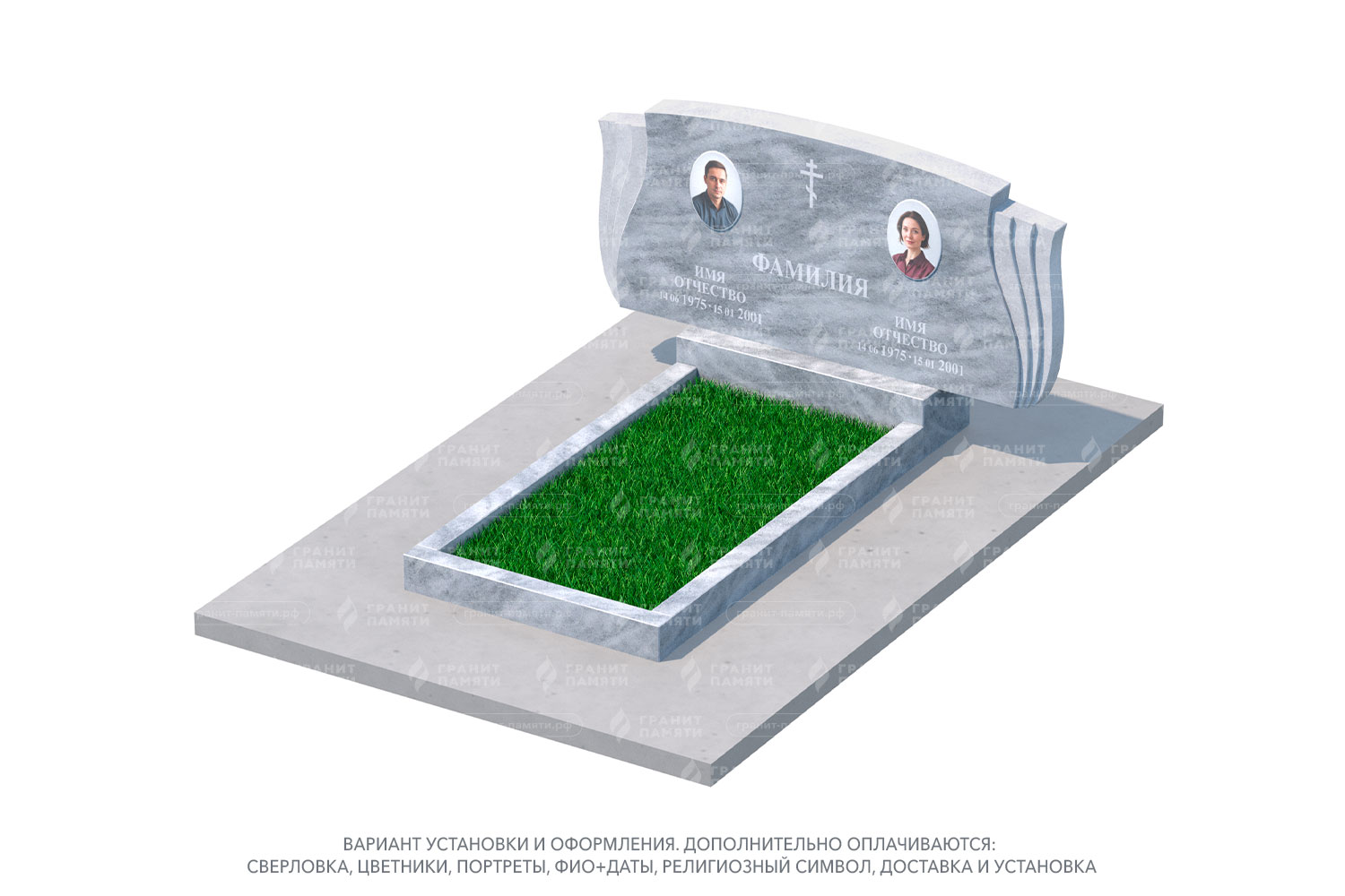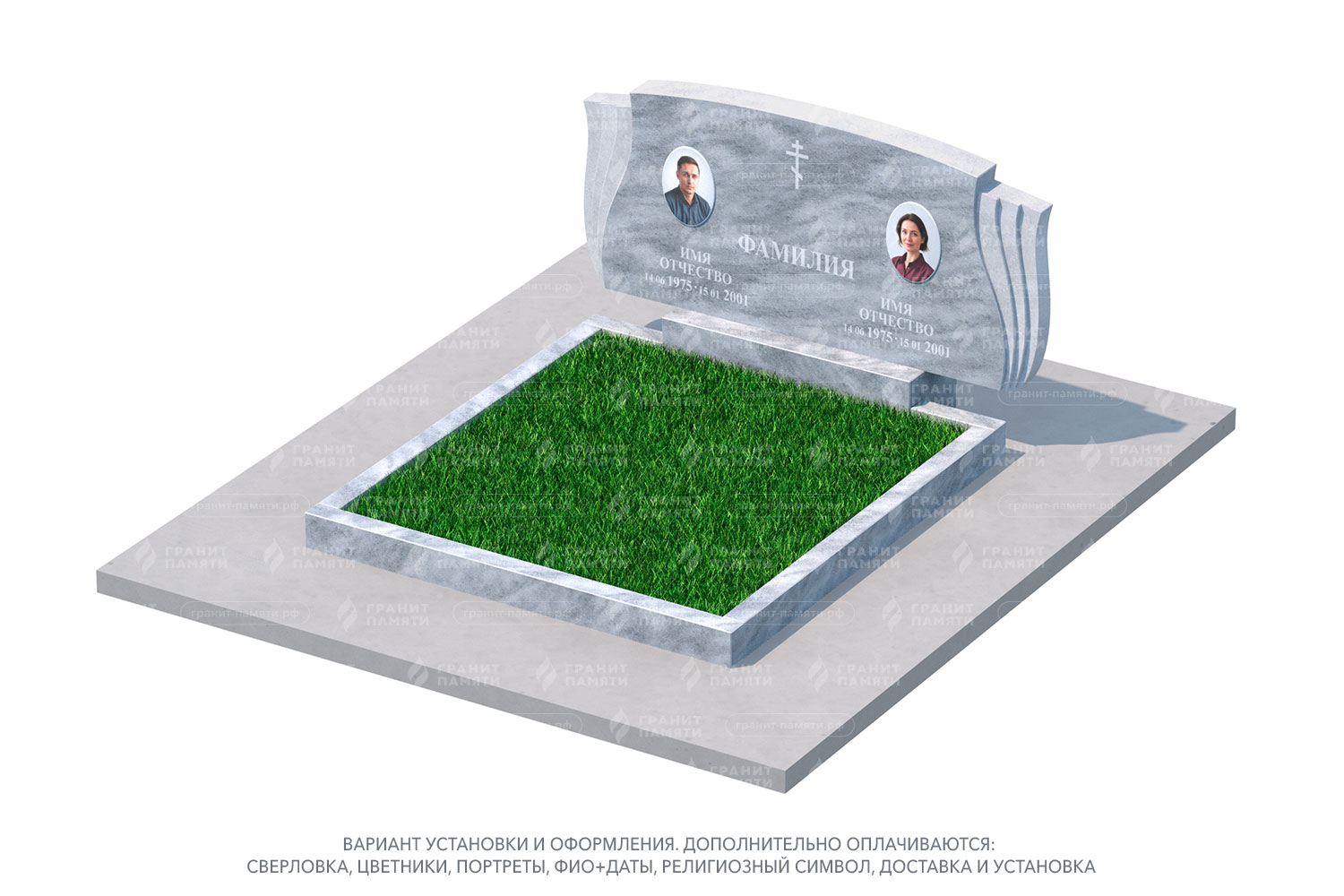 цветник, сверловка, портрет, ФИО+даты, крестик, доставка, установка.